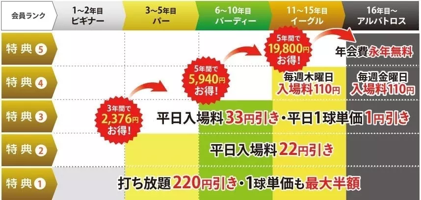 入会継続を4ランクに分け、各ランクに応じた『さらしなファミリー特典』をご用意しています。さらしなゴルフクラブとお付き合いが長くなるほどお得に練習できるプログラムです。