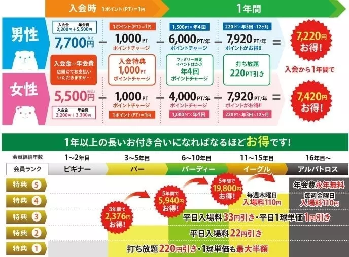 さらしなゴルフクラブに「入会金」「年会費」をお支払いただいたお客さま(『ファミリー』様)の継続年数に応じて特典が変わります。